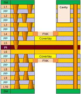 Board Type:Rigid-flex+HDI Application:Communication Layers:10L Structure:4+2F+4 Material:EM528K Finished THK:1.1MM Min W/S:2.5/3.0mil Surface Finish:ENIG | ![]() | ![]() |